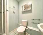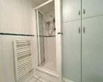 Suite comprising a low level wc; pedestal wash hand basin with a tiled splashback; tiled shower enclosure; wall mounted cabinet; built in linen/storage cupboard; tiled flooring.
