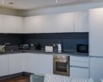 The apartment boasts a large open-plan kitchen and living area, designed for both comfort and practicality. The fully integrated kitchen features high-quality appliances, ensuring a sleek and modern finish. Natural light floods the space, and a Juliette balcony enhances the airy feel, offering beautiful city views.
