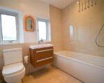 On the first floor, the home features three well-proportioned bedrooms. It includes two spacious double rooms with original exposed floorboards. Additionally, there is a larger-than-average single room. There is ample space for fitted or freestanding furniture in each bedroom. A modern bathroom serves the property, featuring a bath with an overhead shower, wash basin, and WC.