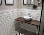 Very large walk in shower with glass screen. Shelf mounted wash basin and toilet. Part tiled walls and tiled floor. Recessed spot lights.