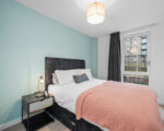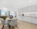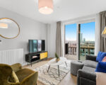 Open the door to this modern home to a generous open-plan kitchen and living space, furnished with a sofa, comfy armchair, coffee table and TV unit. Integrated kitchens feature appliances including a multi-functional oven and induction hob. So, a private balcony connects the living area to the great outdoors. So, the double bedrooms come complete with built-in wardrobes, a chest of draws and side-tables. The bathrooms are completed with a rainfall showerhead and heated mirrors to prevent steaming, with hidden storage. Hence, the master room has a spacious ensuite, creating more privacy and space if you’re sharing.