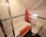 Bathroom – A spacious and stylish room featuring a white three-piece suite, a shower over the bath, and a large mirrored storage area.